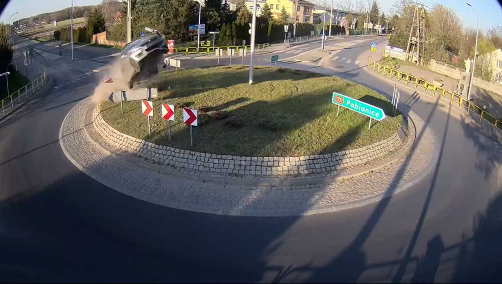 Курйозне, але вражаюче ДТП сталося у польській Лодзі як раз на місцеву Великдень. Сталося воно на перехресті з круговим рухом на національному шосе №71. Водій з незрозумілих поки причин не врахував наявності перешкоди, і огорожу клумби, розміщеної всередині центрального кола, миттєво перетворилося на трамплін.